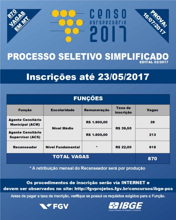 PRORROGADO O PRAZO PARA INSCRIÇÕES DO PROCESSO SELETIVO SIMPLIFICADO 2017 DO CENSO AGROPECUÁRIO