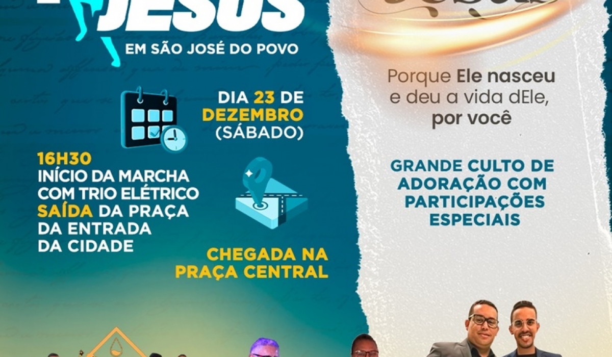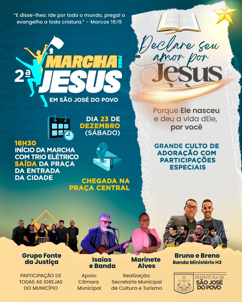 São José do Povo sediará neste sábado (23), a partir das 16h30, a 2ª Marcha para Jesus, com concentração na praça da entrada da cidade. Esta é a segunda edição do evento, que é gratuito, e contará com a presença da pregadora de renome nacional Vitória Souza e bandas locais, como, Grupo Fonte de Justiça, Isaias e banda, Marinete Alves e Bruno e Breno.