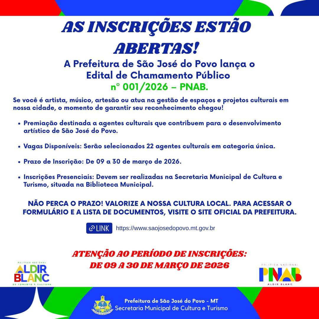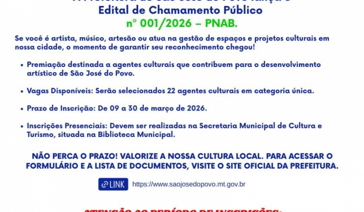A Prefeitura Municipal de São José do Povo, por intermédio da Secretaria Municipal de Cultura e Turismo, oficializou o lançamento do Edital de Chamamento Público nº 001/2026. A iniciativa regulamenta a concessão de premiações culturais no âmbito da Política Nacional Aldir Blanc de Fomento à Cultura (PNAB), instituída pela Lei Federal nº 14.399/2022. O certame visa reconhecer e valorizar a trajetória de profissionais que tenham prestado relevante contribuição ao desenvolvimento artístico e cultural do município.