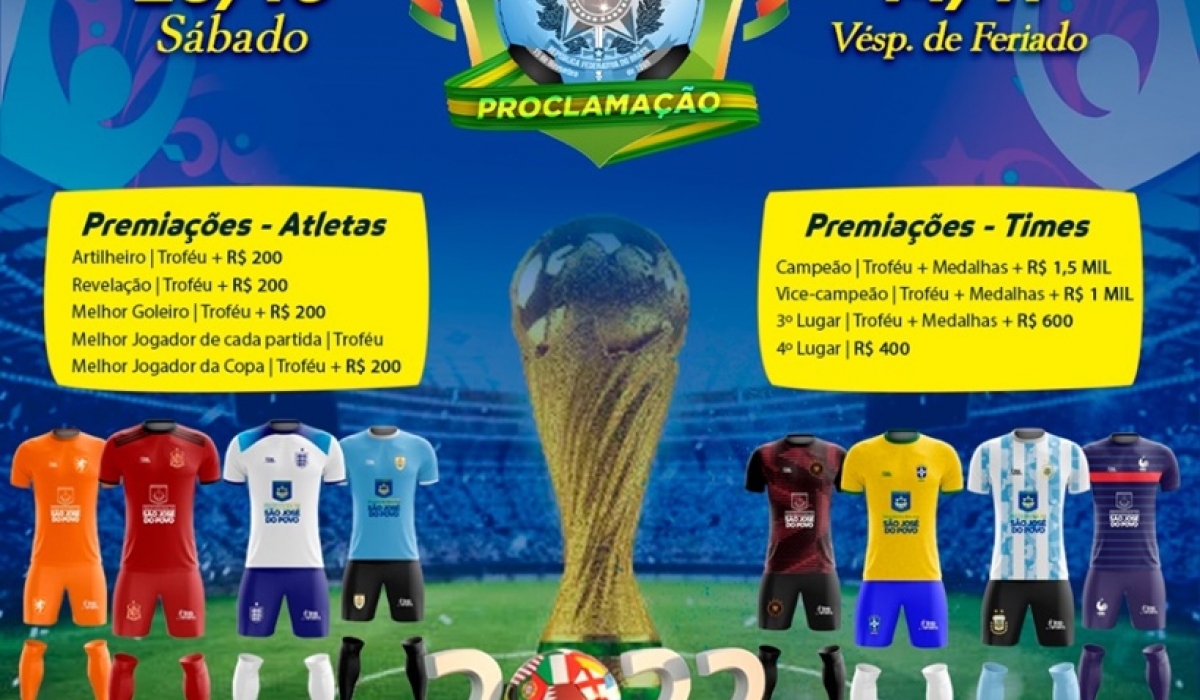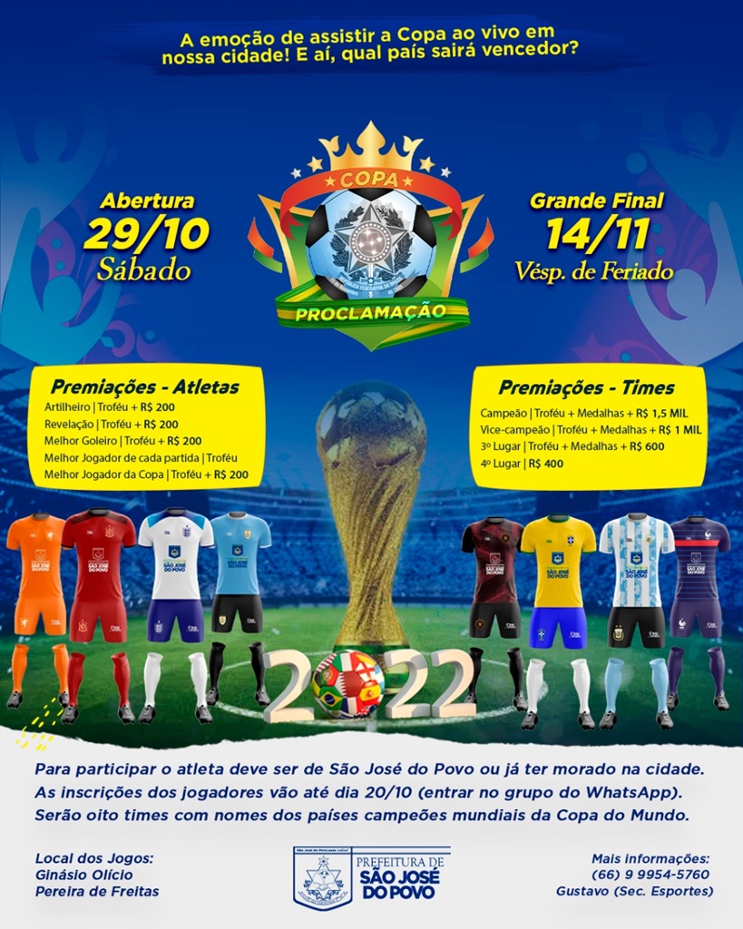 Dentro de poucos dias São José do Povo será palco da 3ª Copa Proclamação de Futsal, evento realizado pela Secretaria Municipal de Esporte e Lazer do município. As disputas serão realizadas de 29 desse mês a 14 de novembro, véspera do Feriado da Proclamação da República (15/11).